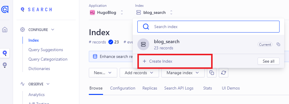 首先執行hugo,會產生一個public的folder,裡面會有所有build起來的資料,會看到裡面有一個 algolia.json,裡面就是相關的索引資料,接著只要輸入 npm run algolia,就可以把資料推到algolia上了。
