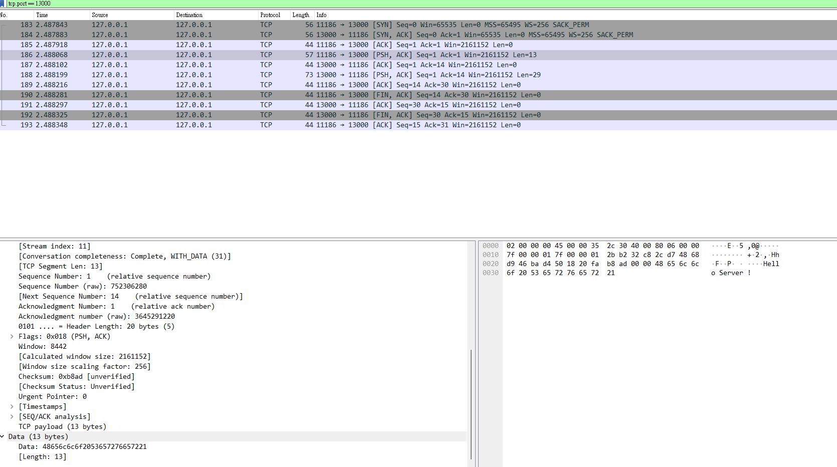 因為我監聽的port號是13000,所以我搜尋條件就先設定tcp.port == 13000,接著使用Client端發送訊息得到了下面的結果。
