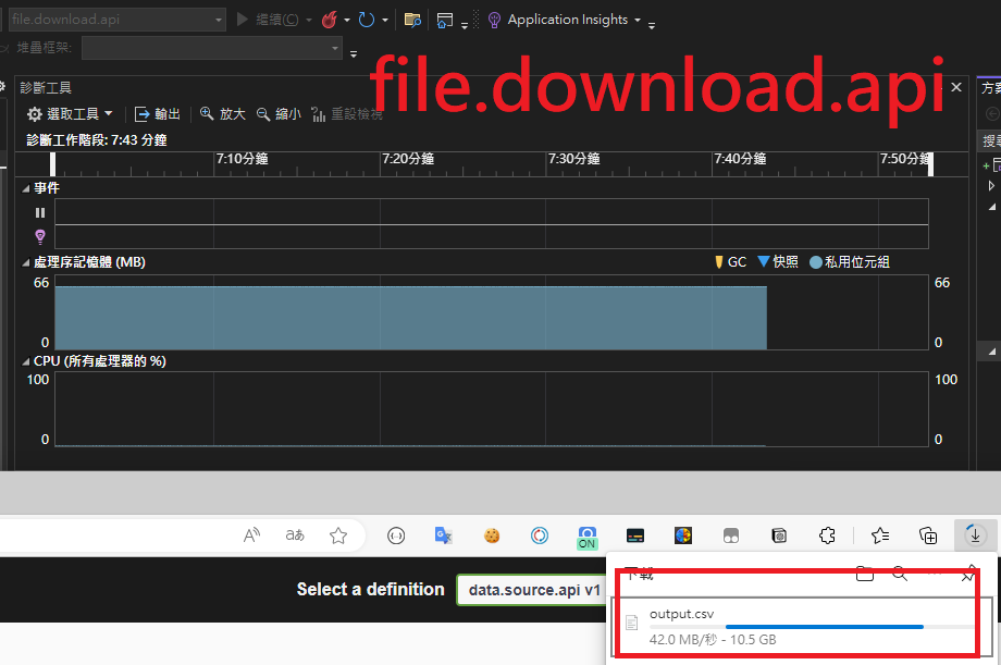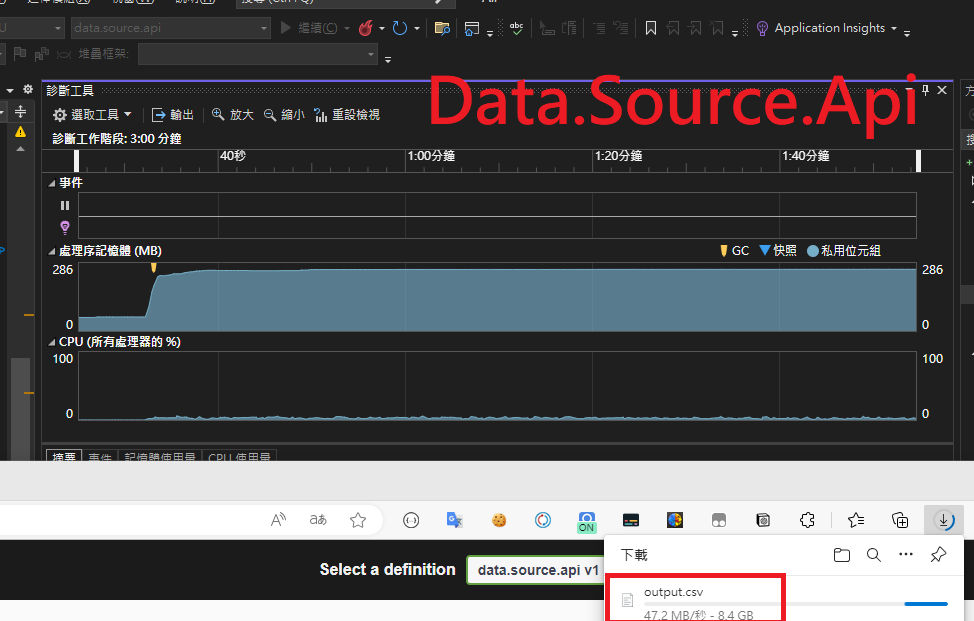 可以看到data-source-apimemory雖然從70多MB成長到286MB,但前端下載的檔案實際上已經到8.4G了,相比之下只是很小的開銷,而file-download api從頭到尾只占用了66MB的記憶體,非常的省XD
